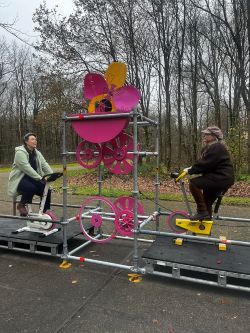 ![]() | Bubble Bike FitnessEen interactieve bellen ervaring waarin het publiek zelf de motor van het spektakel vormt. Deze 5 bij 1 meter grote en 2,5 meter hoge bellenmachine wordt volledig aangedreven door twee hometrainers. De ene fiets zet via wielen en poelies, een krachtige ventilator in beweging, terwijl de andere een groot bellen rad door het sop laat draaien. Alleen door samen te trappen ontstaan de mooiste, glinsterende, zwevende bellen. Een speelse mix van mechanica, samenwerking en verwondering. |