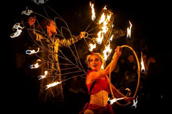 ![]() | VuurkunstenaarDe Vuurkunstenaar biedt een breed uiteenlopend scala aan vurige acts aan en kenmerkt zich door de enorme creativiteit in het op maat maken van grote spektakels. Het assortiment is verrassend en de vuren groots! VuurpoortDe Vuurpoort is een spectaculaire ontvangst act vol vuur. Een installatie van 11 meter breed en 6 meter hoog. Vuurperformers, als poortwachters, verwelkomen de gasten van het festival in stijl. Uitvoerbaar in diverse stijlen zoals Mad Max, Middeleeuws, Sjiek, Circus en meer. De letters bovenop de Vuurpoort zijn naar wens samen te stellen. |