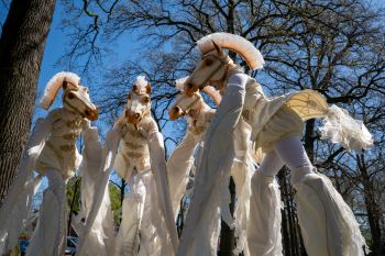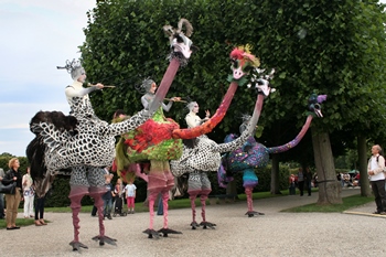ClariniWhen you meet the Clarini, you imagine yourself in a painting by Hieronymus Bosch. Mystic music plays. A monk with a barrow escorts a procession of long caped characters. Tranquil and serene, they take time to make their synchronized movements. Their trumpet-like masks make alien noises. Suddenly they produce little fountains that sprinkle the audience. Are we witnessing a mysterious ritual? | AntilopiFrom a distance, the family Antelope approaches proudly and elegant. Carefree, the antelope child frolics and dances between the adult animals. However these animals are always alert to imminent danger. If they detect trouble they point their ears simultaneously. Anxious the antelopes listen, their heads held high. With their large gleaming eyes they penetrate their surroundings. For a moment they stand motionless. Not before they are sure that everything is safe, the family Antelope continues gracefully. | Le DameMake way for the upper class Ladies. These women love to be admired for their beautiful heaving skirts. But they really want you to bow for them, for they look down upon the common people. Their poor servant experiences this every day. It seems they will find pleasure in humiliating her and they call her to fo the most futile things. Is the housemaid really putting up with this treatment? |