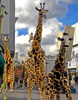 ![]() | Neighbourhood Watch Stilts InternationalLes Oiseaux de LuxThe most well-known NWSI stilt act. Les Oiseaux de Lux is an invasion of giant wingless birds and their riders. For the last 20 years they have made friends, performed street interventions and parades, and created amiable mayhem. Wherever in the world there is a zone of under-entertainment the birds respond... No task is too difficult and no journey too long. |